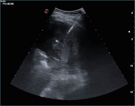 Figura 1.Visione ecografica di lesione polmonare adesa alla pleura compatibile con adenocarcinoma polmonare con ago da biopsia al suo interno.