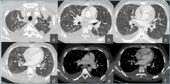 Figure 1.(a-d) Interlobular septal thickening - lung window. (e-f) No evidence of pulmonary embolism or left atrial enlargement -mediastinal window.