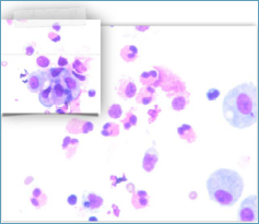 Figure 2.BAL: Eosinophils are the predominant cells in the field. Scattered foamy macrophages (and without intracytoplasmic inclusion typically observed in smokers) and lymphocytes are present as well (Diff-Quick, x 40).A cluster of hyperplastic/reactive type II pneumocytes (inlet; Diff Quick, x 40).